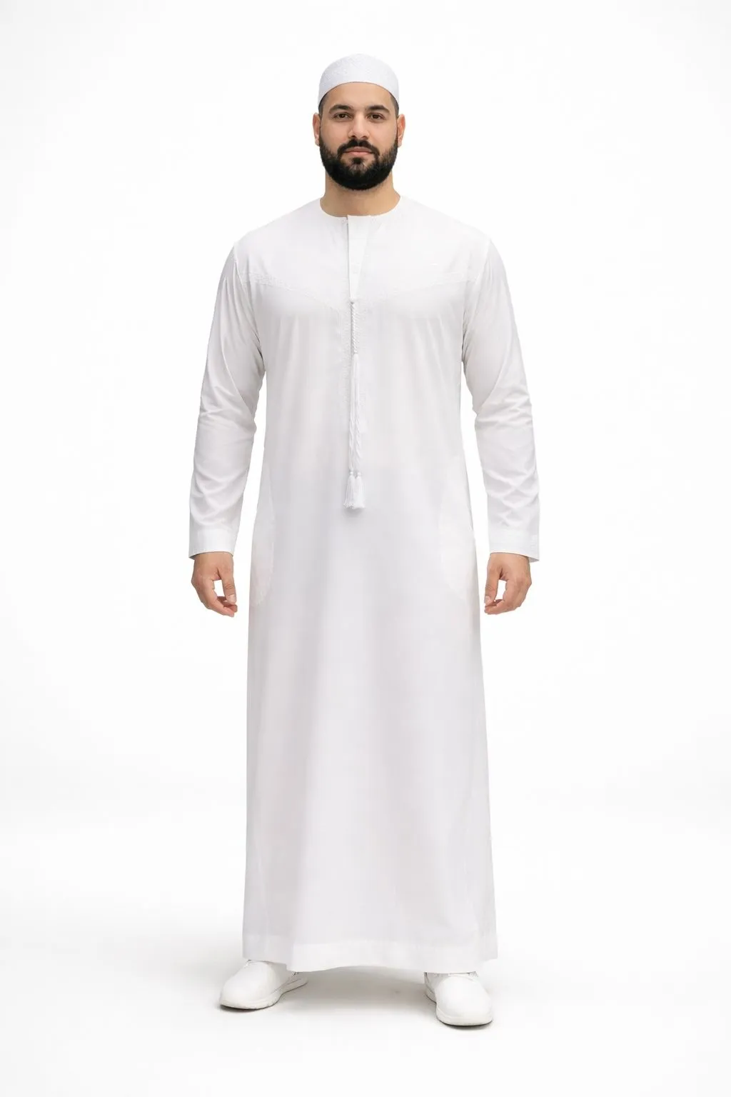 Traditionele Emirati Qamis met rits en het kenmerkende touwtje. Voorzien van het klassieke borduursel dat schuin van de schouder naar de borst loopt en twee zijzakken. Comfortabel wijd model, ideaal voor gebed, Jummah, Eid of dagelijks gebruik. Lees meer