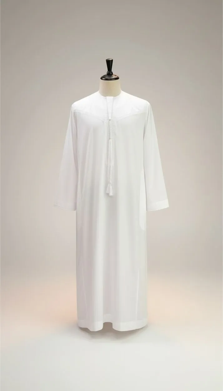 Daarnaast is de qamis voorzien van het traditionele touwtje bij de hals, een kenmerkend element van de Emirati stijl.