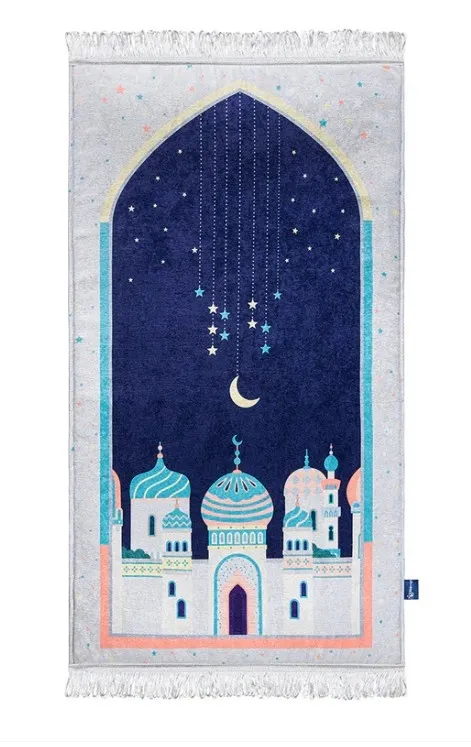 Breng rust in je gebed met het Blue Crescent Moon gebedskleed van Urban Rugs UK. Dit gebedskleed toont een kalmerend ontwerp van een blauwe halve maan tegen een sterrennacht, ideaal om je gebedsruimte een serene sfeer te geven.