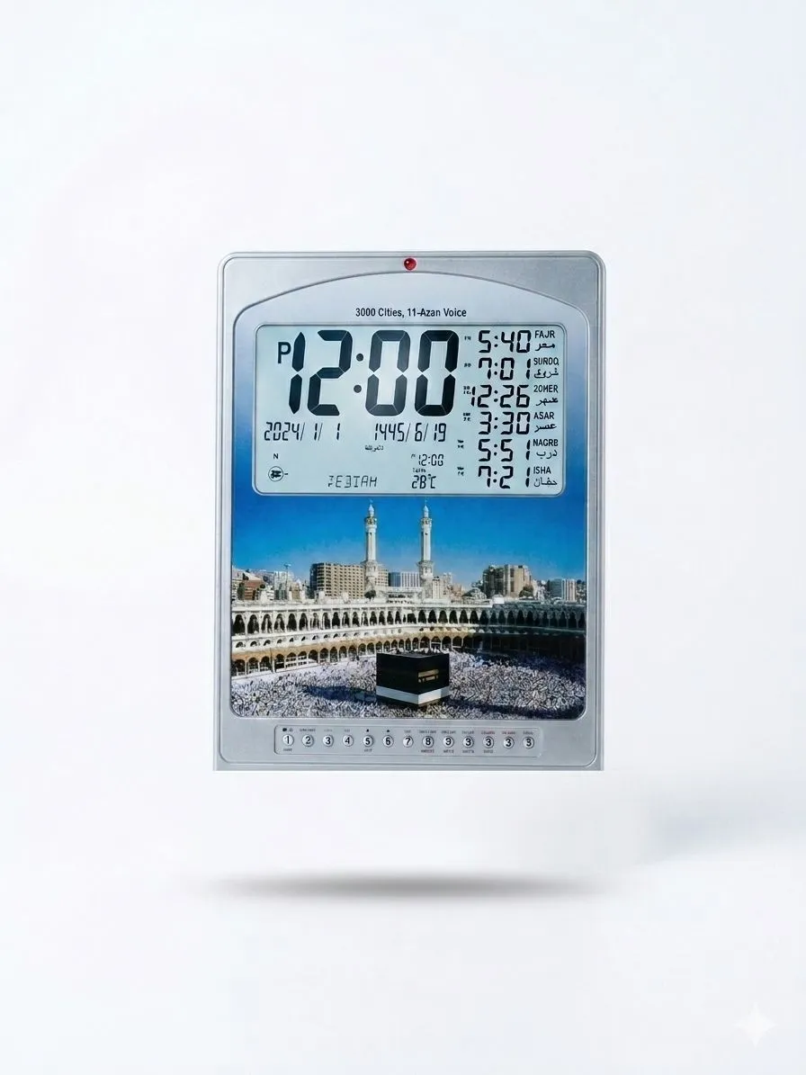 Islamitische azan klok met Kaaba design en wereldwijde dekking