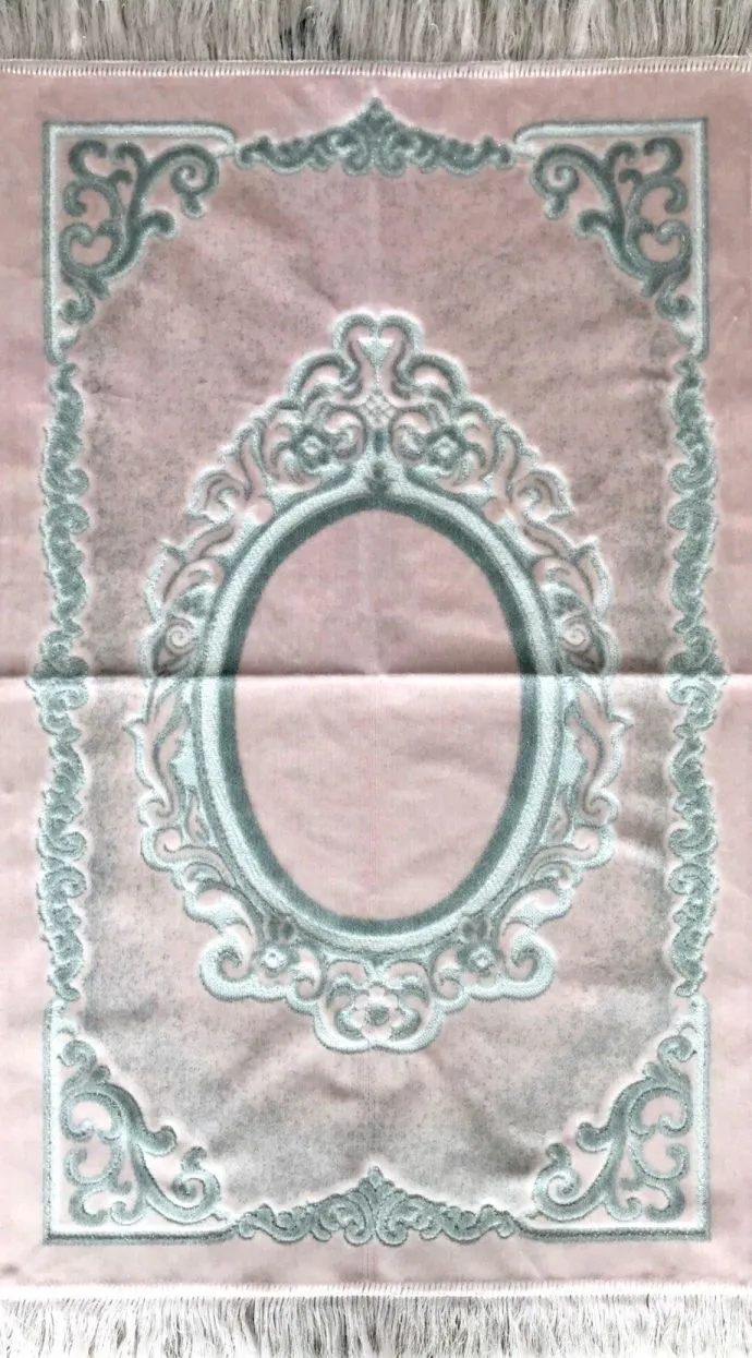 Roze kleurig, fluweel achtig gebedksleed. In het gebedskleed zijn glitters verwerkt wat het gebedskleed uniek maakt.