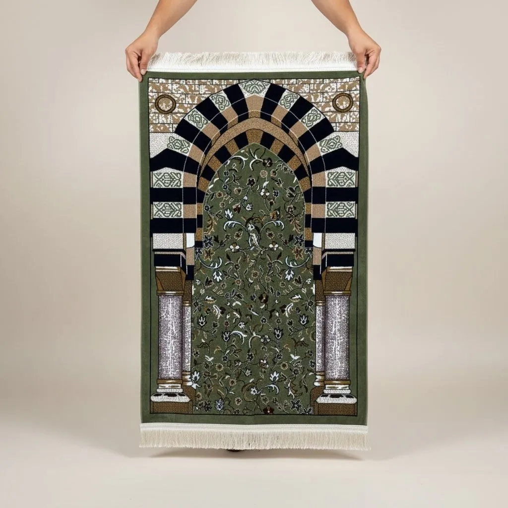 Luxe Madinah Mihrab gebedskleed in groen, geïnspireerd op Masjid an-Nabawi. Hoogwaardige afwerking, zachte bovenlaag en anti-slip onderkant. Geproduceerd in Turkije voor optimale kwaliteit en comfort tijdens het gebed. Lees meer