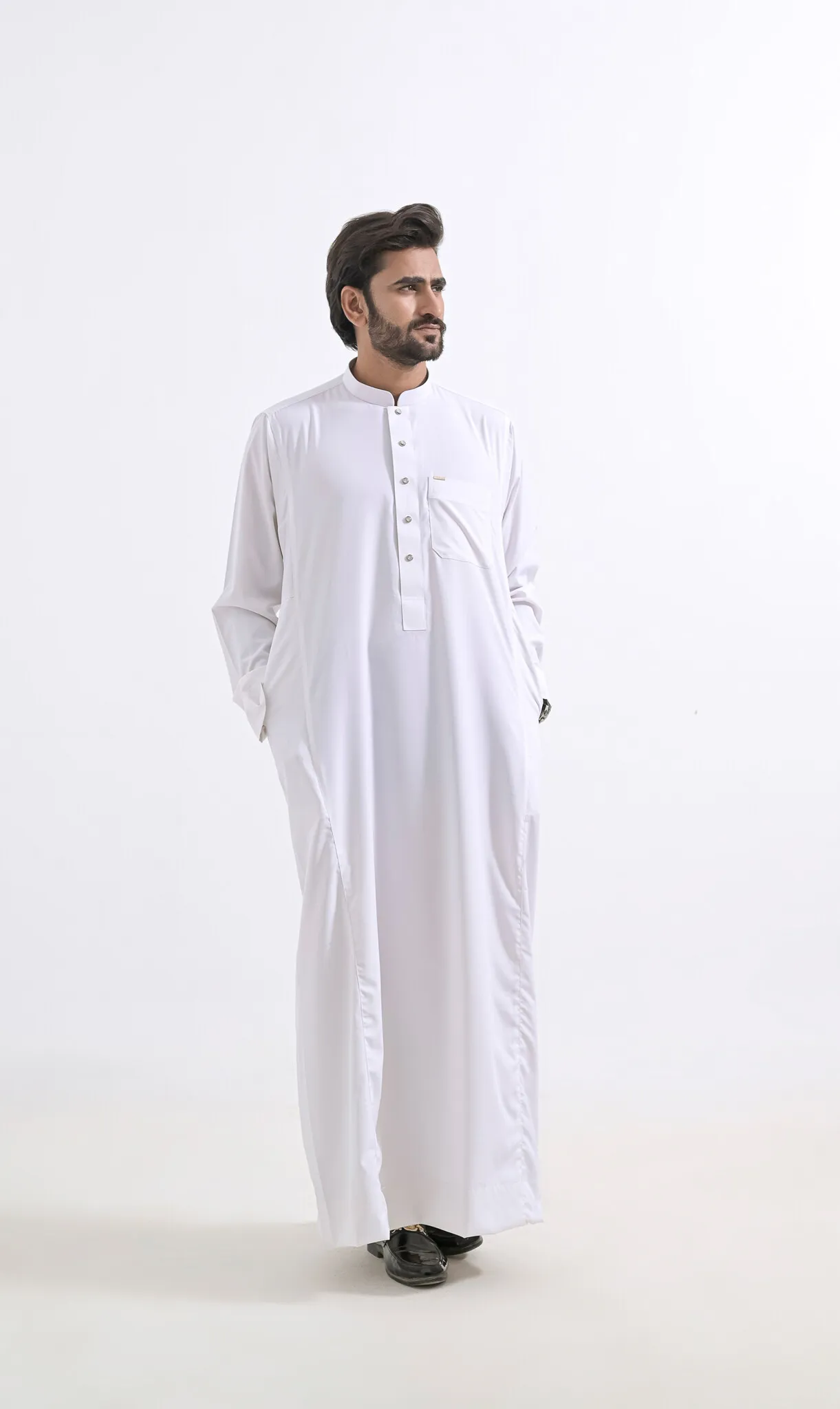 Deze stijlvolle Saudi Qamis is ideaal tijdens de zachte periode van het jaar. De stof is soepel en flowy en hiermee tijdens het dragen erg comfortabel. Maar dit is niet alles, ook de pasvorm is uitmuntend. Laat ons je de juiste maat kiezen en deze Qamis zit als gegoten.
