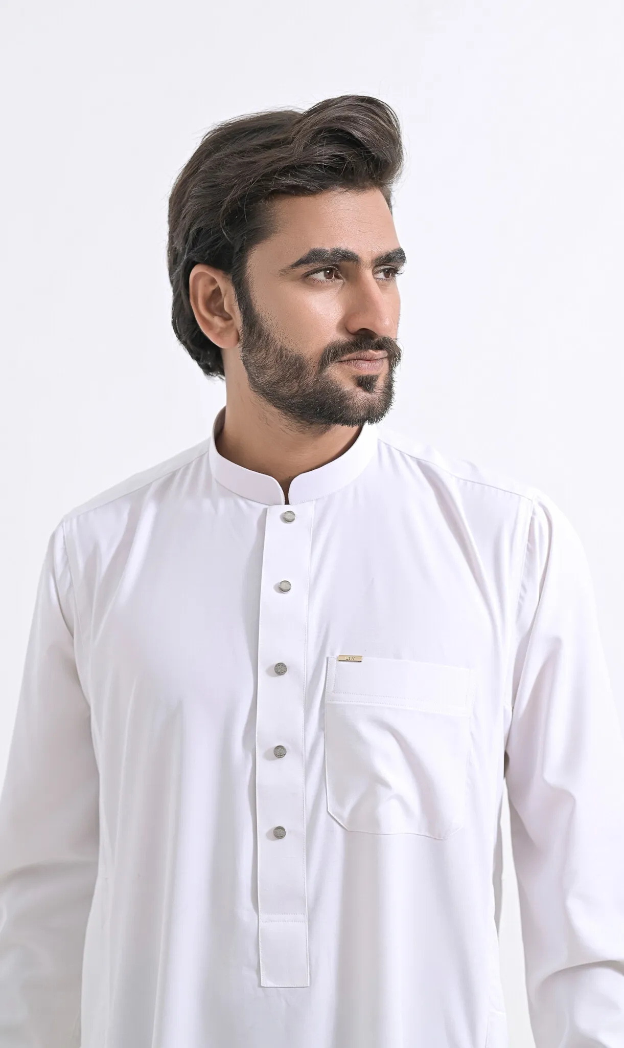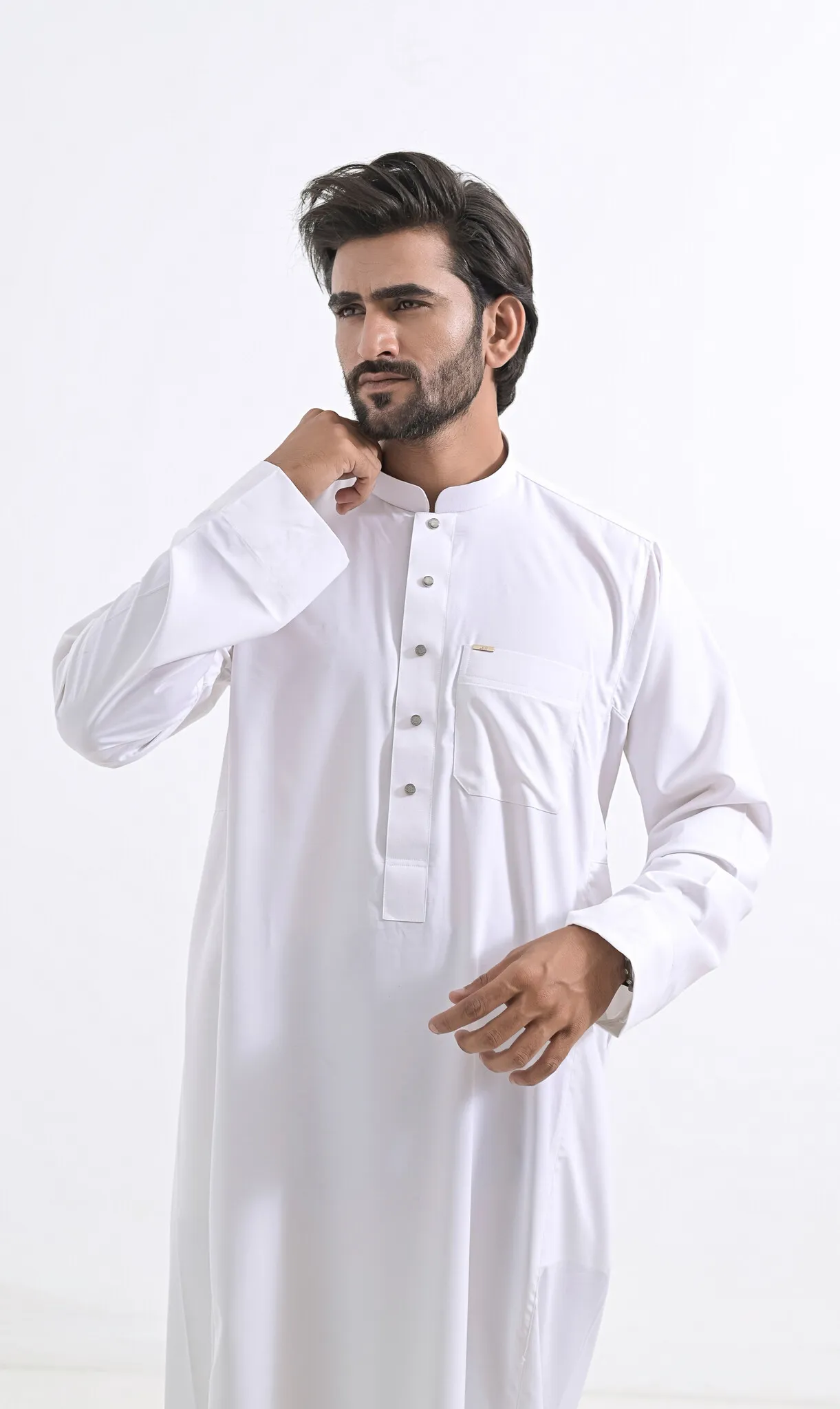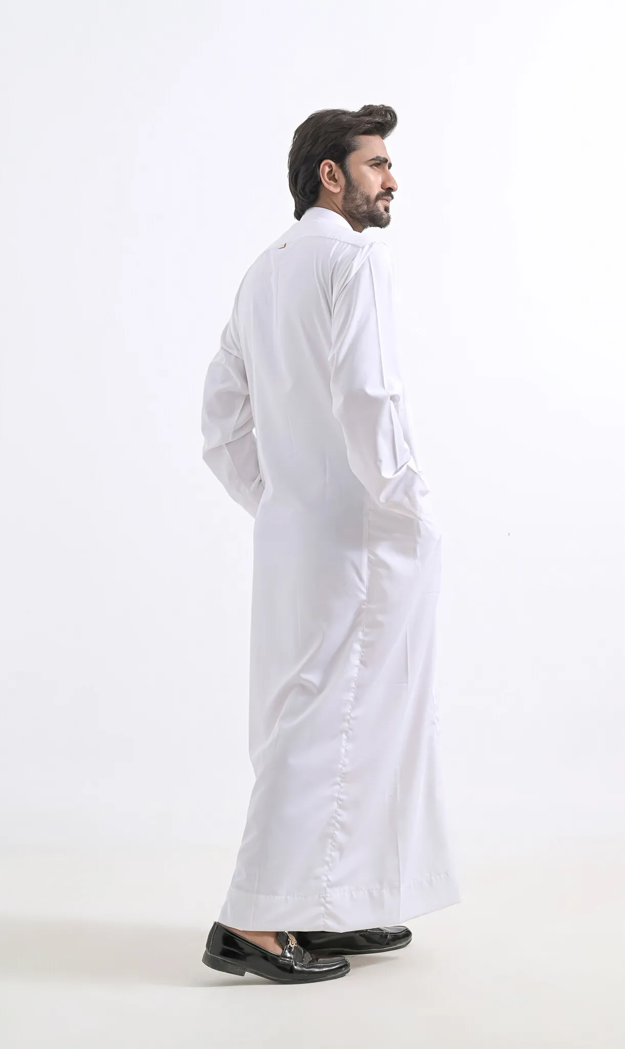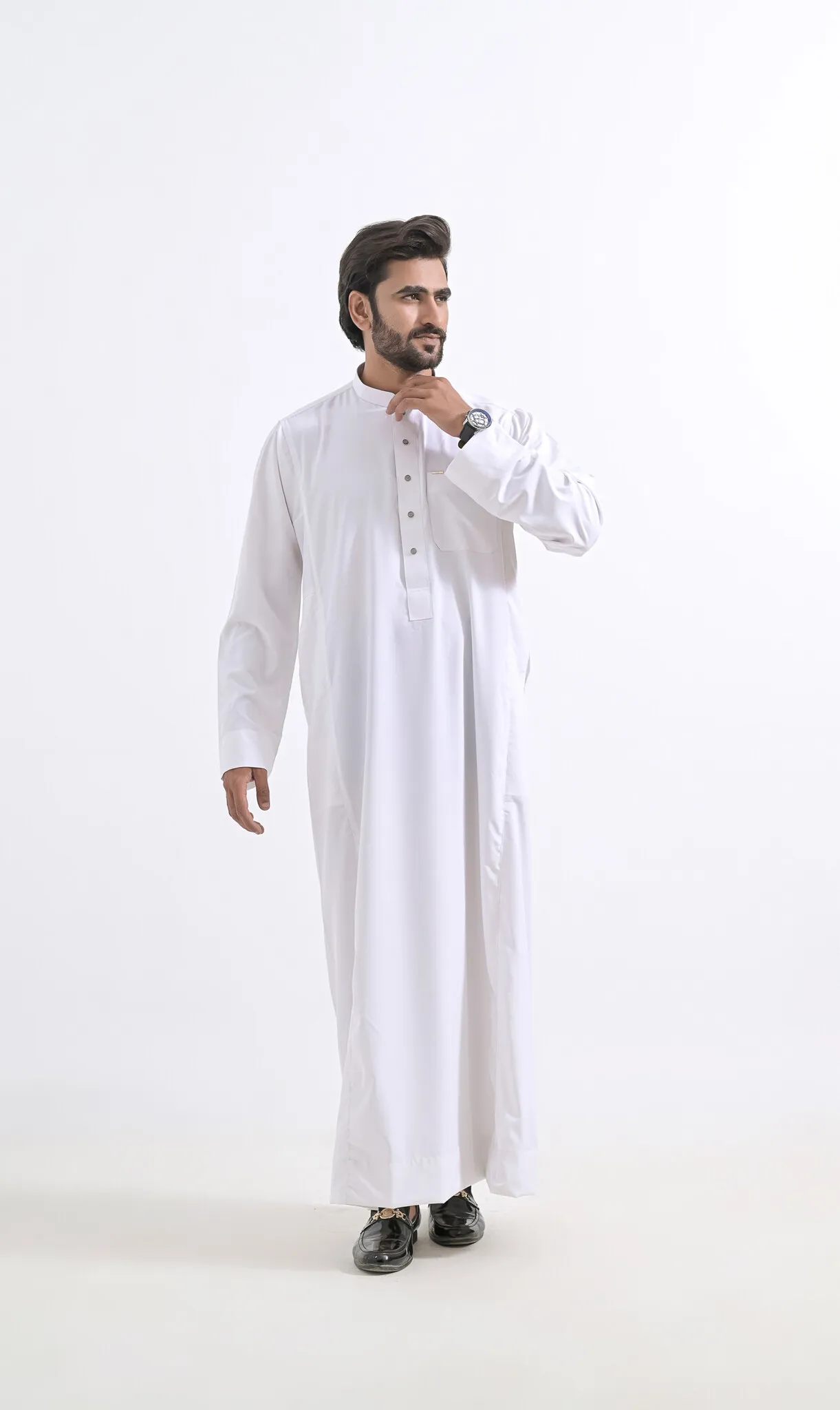 - Ons model, is 175 cm lang en heeft een medium postuur. Hij draagt de Qamis TR in de maat 56-M/L.