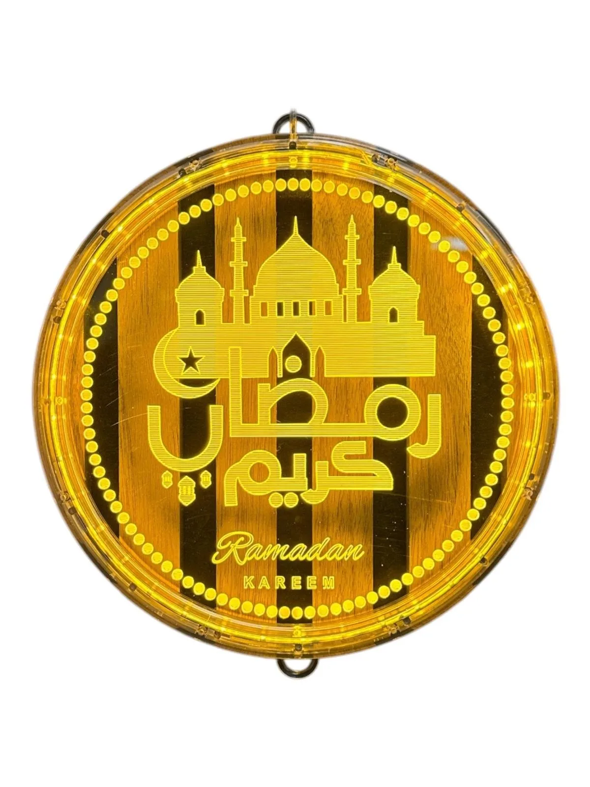 Het doorzichtige plexiglas toont de elegante inscriptie "Ramadan Kareem", verlicht door de ingebouwde verlichting. Dit ontwerp verspreidt een zachte, warme gloed die de vreugdevolle geest van Ramadan weerspiegelt en een stijlvolle toevoeging vormt aan elk interieur.