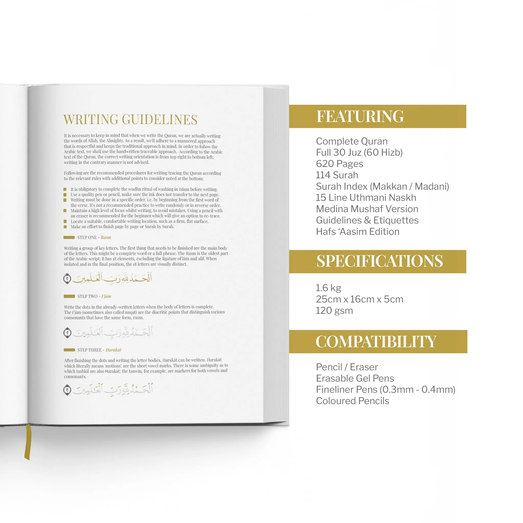 Het ontwerp van de omslag combineert de klassieke Thuluth-scriptvariëteit van de islamitische kalligrafie met een hoogwaardige, eigentijdse productie en weerspiegelt perfect onze unieke mix van Oosterse en Westerse uitmuntendheid. Gedrukt met behulp van premium Turkse goudfolie afkomstig uit Istanbul, is het boek verkrijgbaar in twee tijdloze kleuren: zwart, wit, groen en roze.