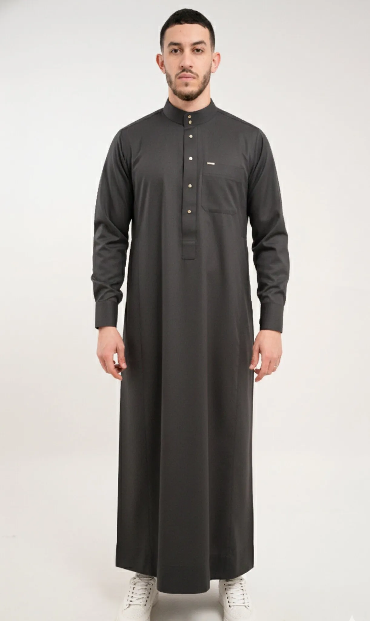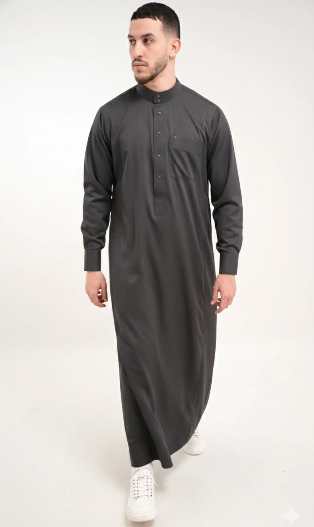 Moderne Saudi Qamis in Chino-stijl met getailleerde pasvorm, lage ronde kraag, borstknopen en diepe zakken. Ideaal voor herfst, winter en lente. Verkrijgbaar in M/L en XL/XXL met lengtematen afgestemd op lichaamslengte. Lees meer