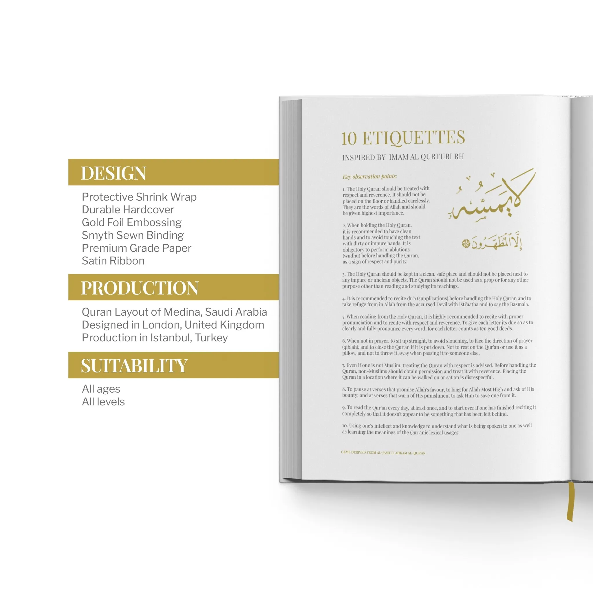 Het ontwerp van de omslag combineert de klassieke Thuluth-scriptvariëteit van de islamitische kalligrafie met een hoogwaardige, eigentijdse productie en weerspiegelt perfect onze unieke mix van Oosterse en Westerse uitmuntendheid. Gedrukt met behulp van premium Turkse goudfolie afkomstig uit Istanbul, is het boek verkrijgbaar in twee tijdloze kleuren: zwart en wit.