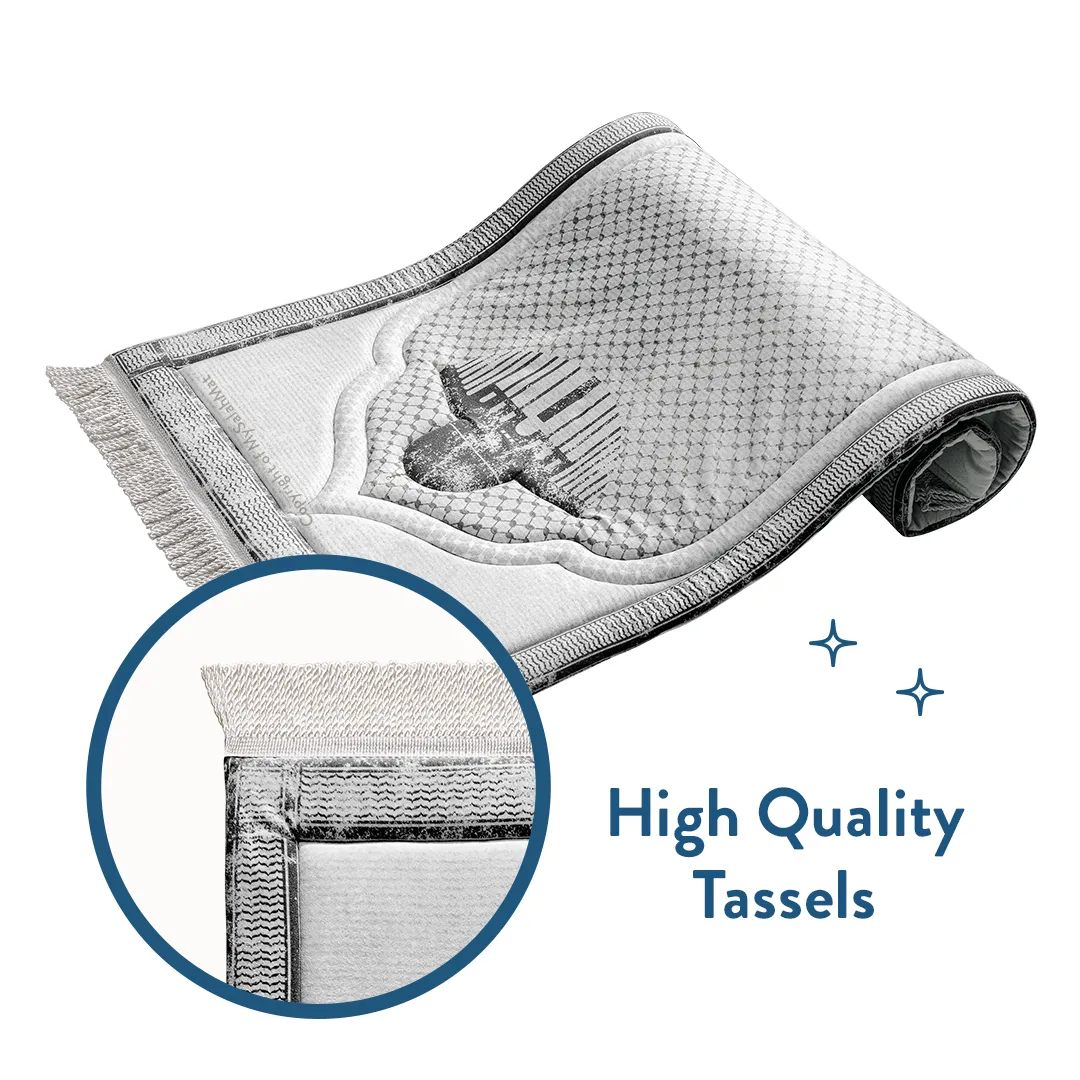Het Palestinian Kufiya Design gebedskleed van Urban Rugs UK is meer dan alleen functioneel — het is een krachtig symbool van veerkracht, identiteit en verbondenheid. Geïnspireerd op het klassieke zwart-witte Kufiya patroon brengt dit kleed betekenis en spiritualiteit samen.