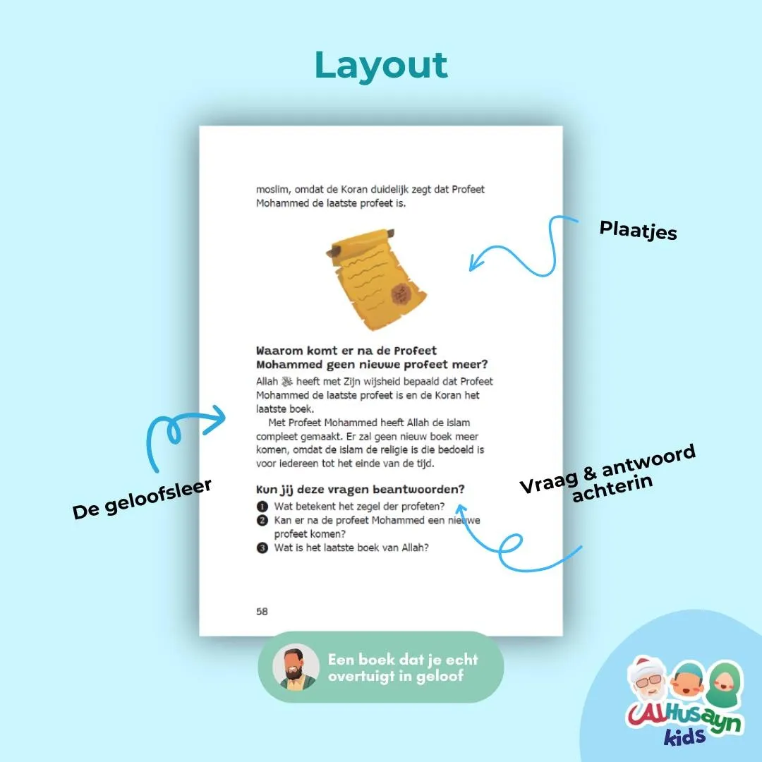 Wat dit boek uniek maakt, is de combinatie van eenvoudige taal, kleurrijke illustraties en interactieve elementen zoals vragen en antwoorden. Kinderen ontdekken wie Allah is, wat profeten doen, wie de Profeet Mohammed ﷺ was, wat de Koran betekent, wie de engelen zijn en wat er gebeurt op de Dag des Oordeels.